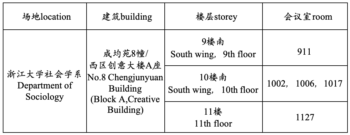 From 2:00 PM to 9:00 PM on October 31st, please check in at the registration desk and collect the conference pack (including the conference manual and guest ID) at the library of the Department of Sociology, Zhejiang University (Elevators are available on both wings of Block 8 of Chengjunyuan. Please take the elevator of the north wing to 10th floor and turn right after exiting).Registration desk also opens from 09:00am to 12:00am on November 1st.The nearest gates to the Department of Sociology are 1st South Gate and 2nd South Gate of Zhejiang University.